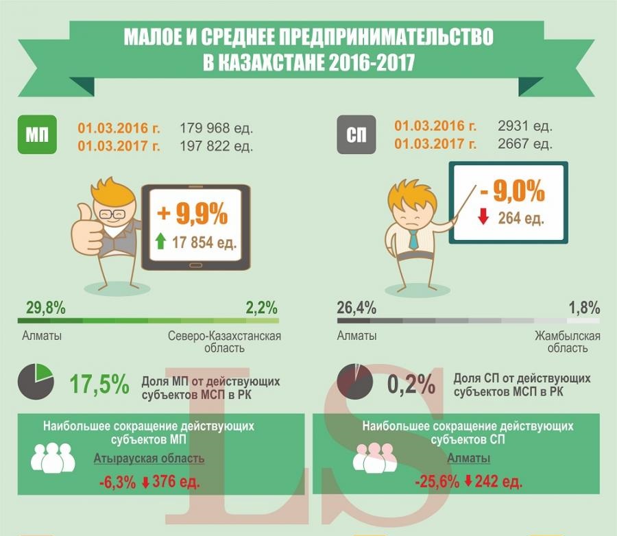 За 2016 год количество МСП в Казахстане составило 1,2 млн - меньше, чем в 2015 году, на 8,1%, или 104,5 тыс.