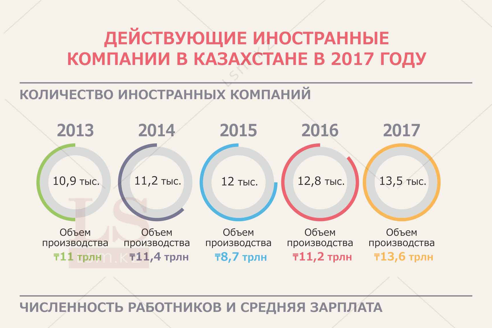 При этом, если с 2013 году в иностранных компаниях работали 436 тыс. человек со средней зарплатой 185,2 тыс. тенге в месяц, то в 2017 году штат сотрудников таких юрлиц составил 451,4 тыс. человек при средней зарплате в 263,5 тыс. тенге.
