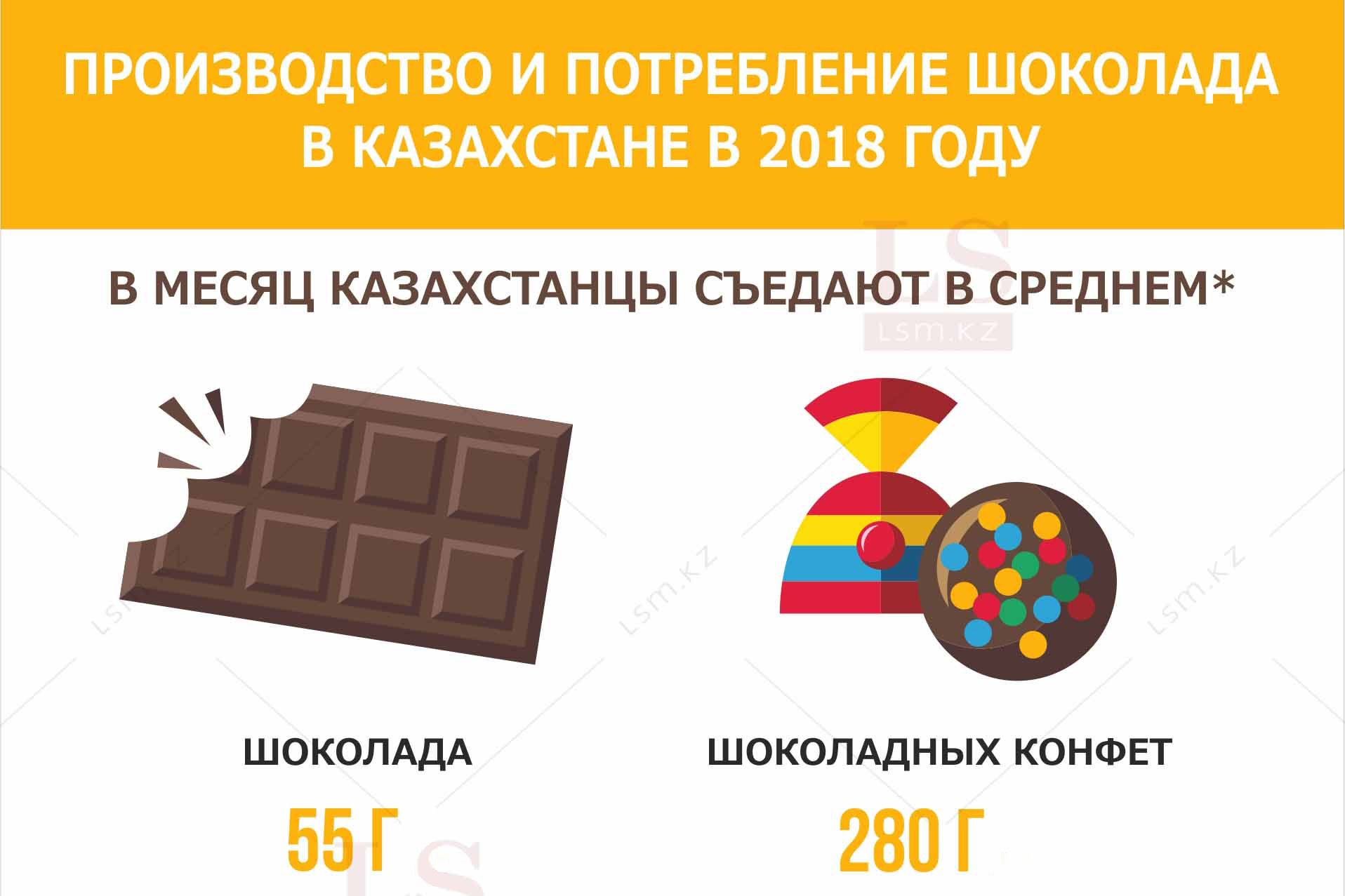 По данным комитета по статистике, в месяц казахстанцы съедают в среднем по 55 граммов шоколада и по 280 граммов шоколадных конфет. При этом на внутреннем рынке продано 162,7 тыс. тонн (78,7%).