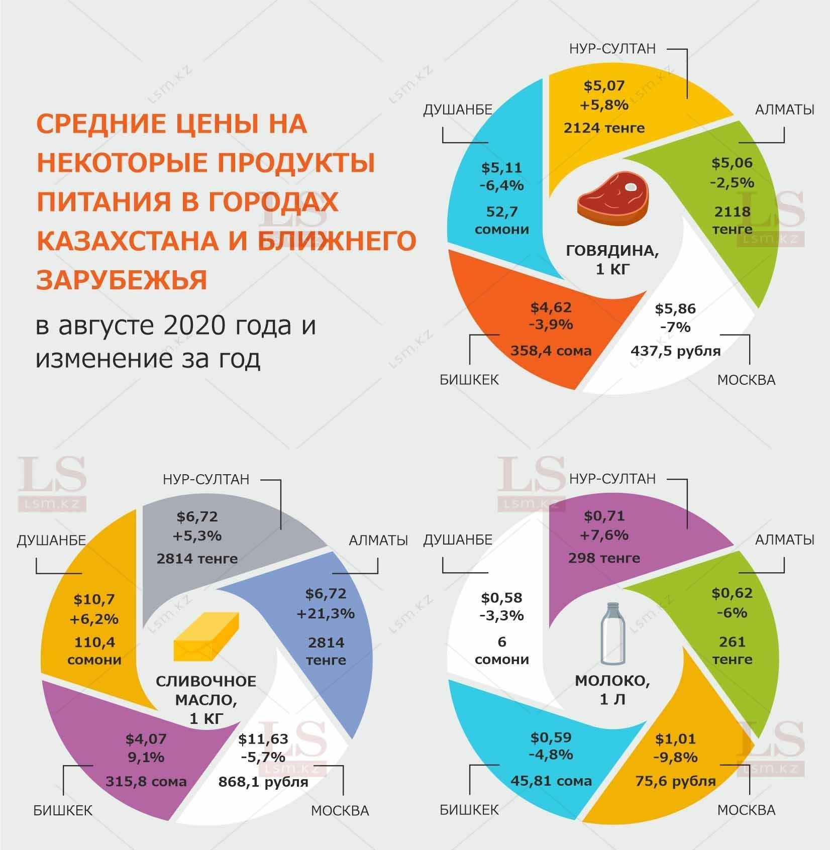 В инфографике представлена более подробная информация о ценах на продукты питания в городах Казахстана и стран ближнего зарубежья и их изменениях за год.