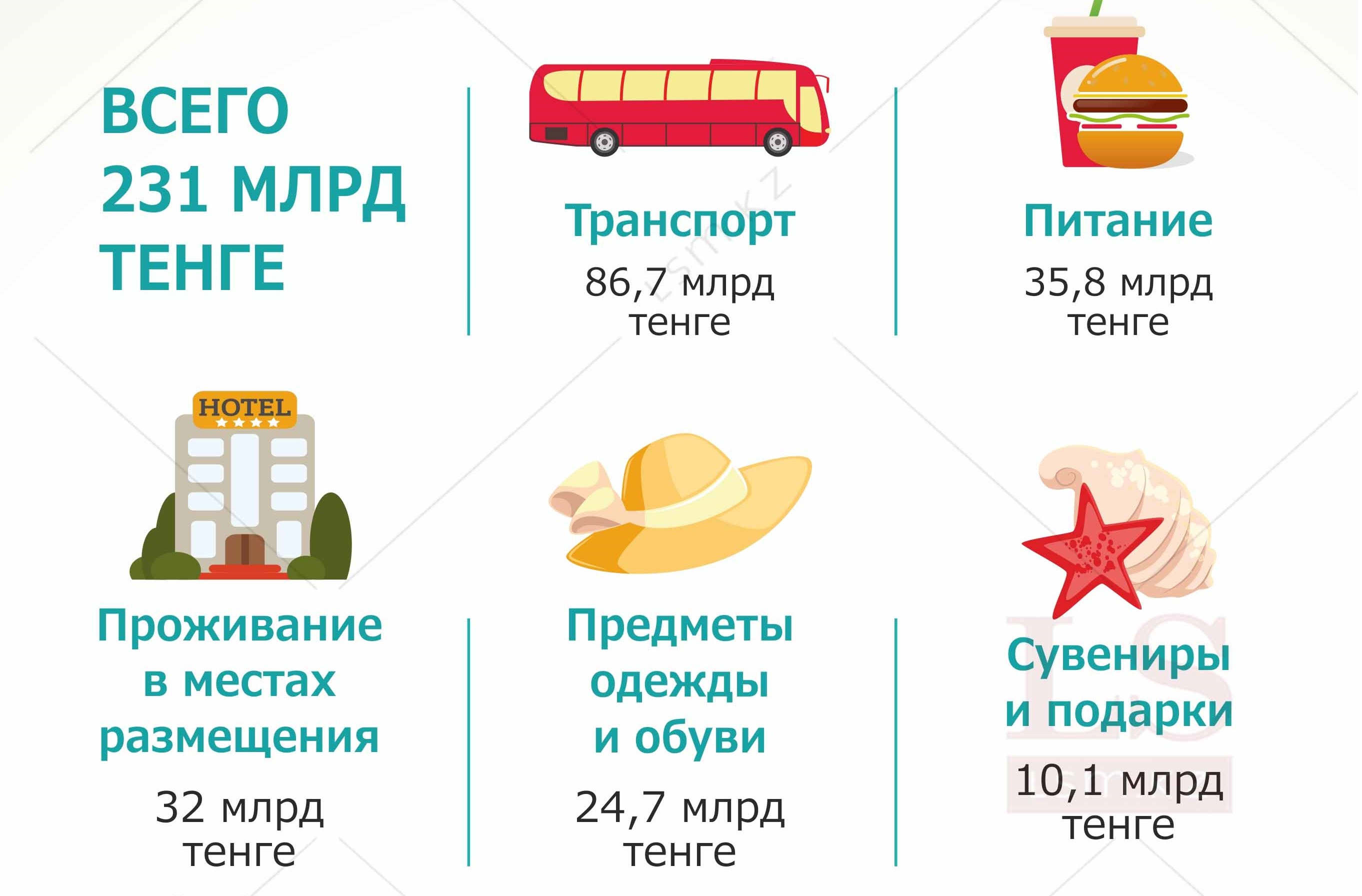 Более трети потраченных средств пришлась на транспортные расходы (86,7 млрд тенге). На питание у туристов ушло 35,8 млрд тенге, а на проживание в гостиницах – 32 млрд тенге.