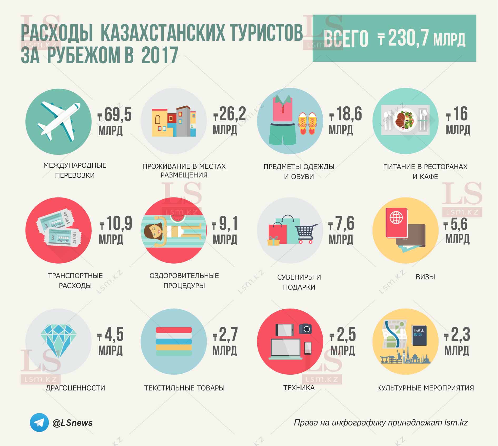 Расходы казахстанских туристов за рубежом в 2017 году составили 230,7 млрд тенге, передает LS.