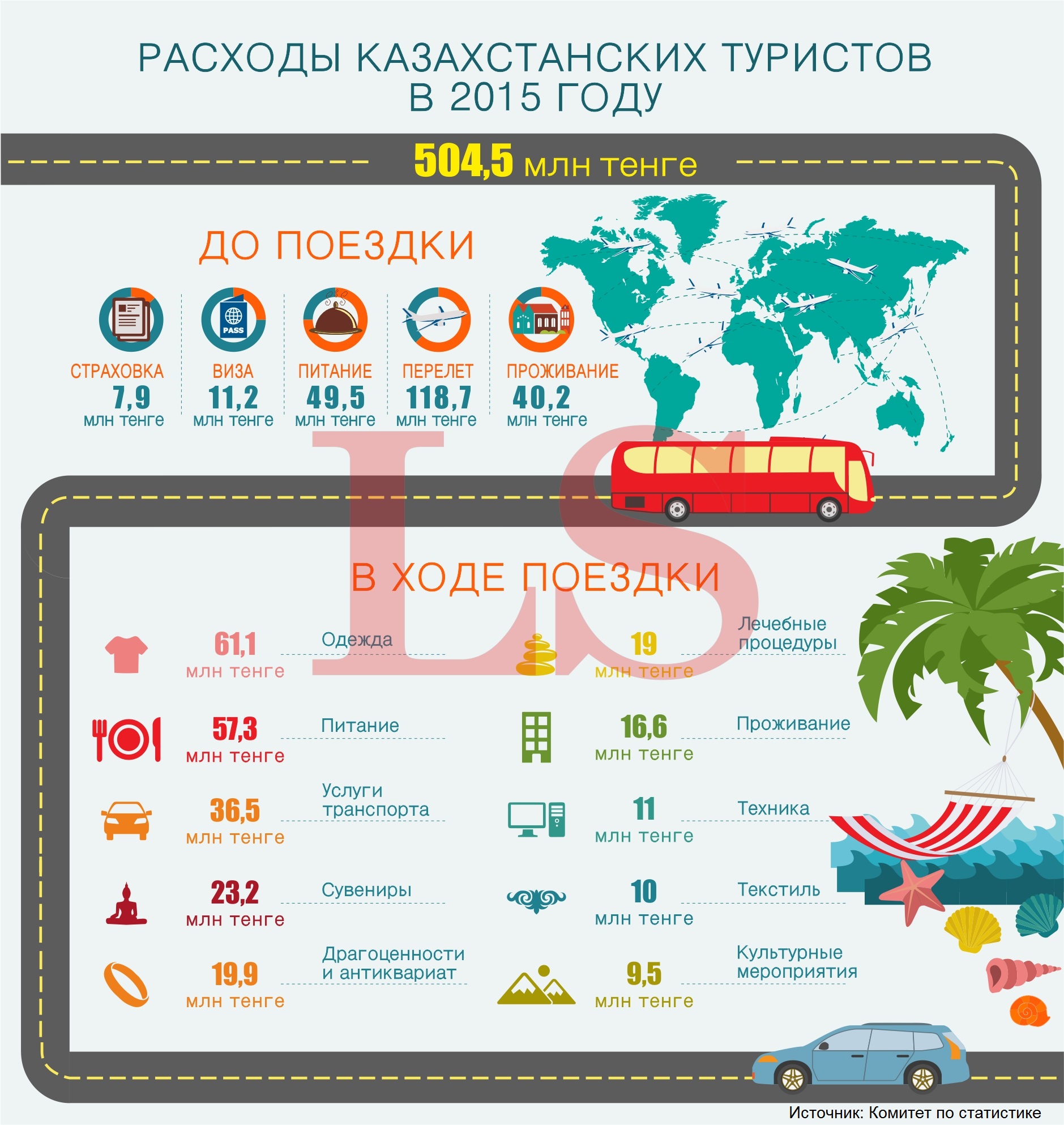 Еще до поездки казахстанцы потратили 233,7 млн тенге. Дороже всего нашим соотечественникам обходится перелет. На международный трансфер туристы потратили 118,7 млн тенге. Проживание в гостинице обошлось казахстанцам в 40,2 млн тенге, а за питание заранее было заплачено 49,5 млн тенге. Оформление визы и страховки стоило соотечественникам 11,2 млн тенге и 7,9 млн тенге соответственно.