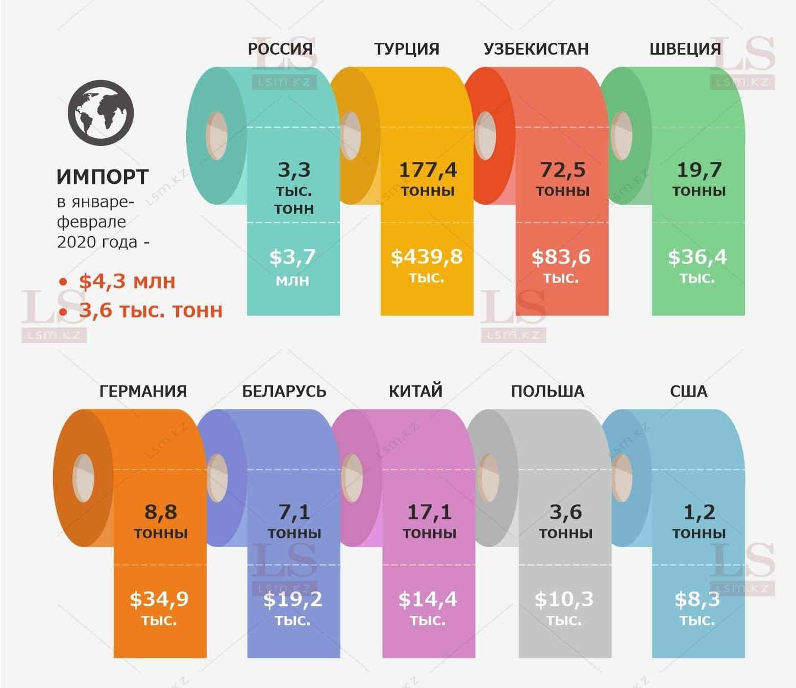 В январе-феврале 2020 года в Казахстан завезли 3,6 тыс. тонн туалетной бумаги на $4,3 млн. Основным поставщиком оказалась Россия, откуда привезли 3,3 тыс. тонн продукции на $3,7 млн. Также туалетная бумага была импортирована из Турции, Узбекистана, Швеции, Германии, Беларуси и других стран.