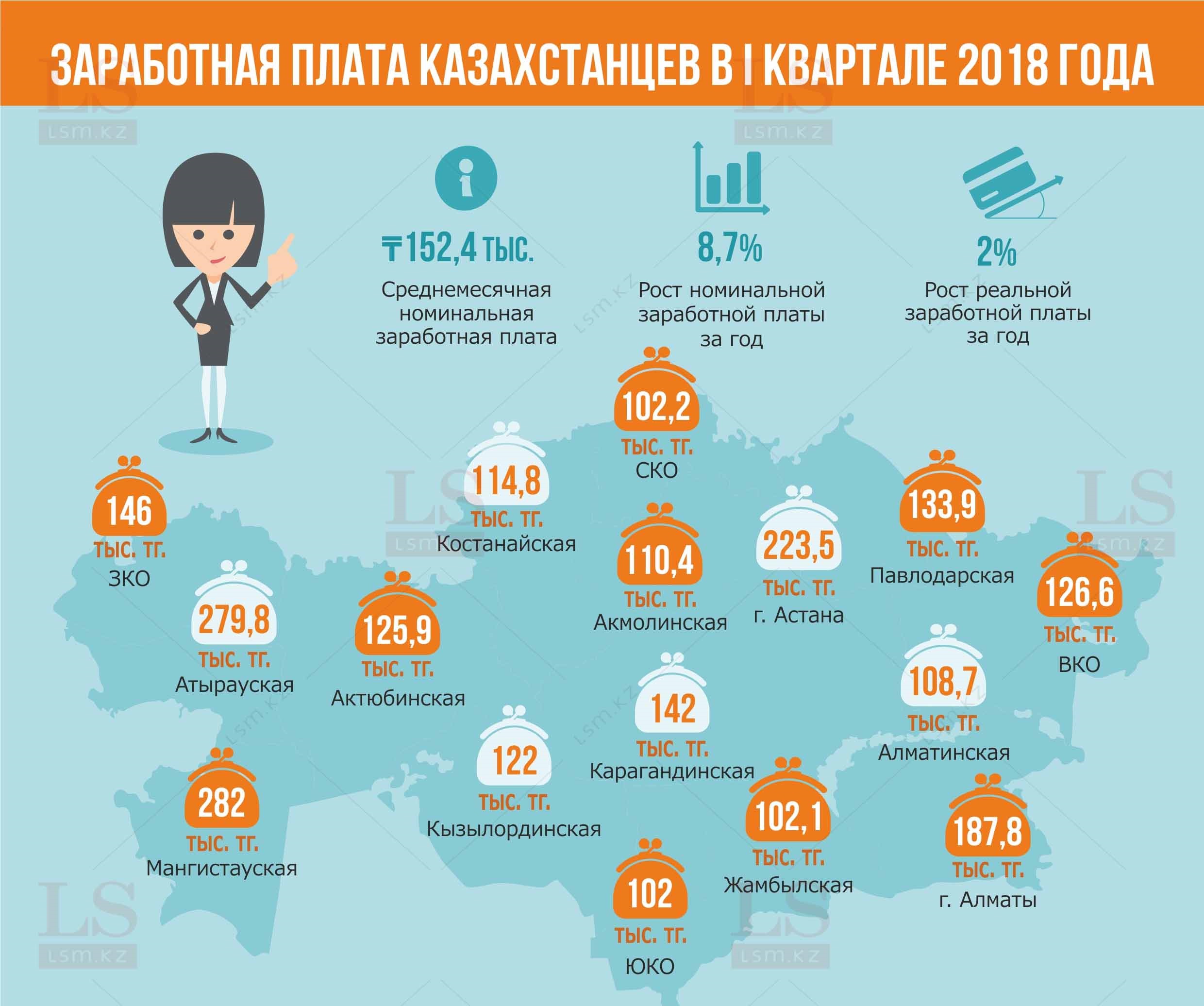 В I квартале 2018 года среднемесячная номинальная заработная плата в Казахстане составила 152,4 тыс. тенге, передает LS.