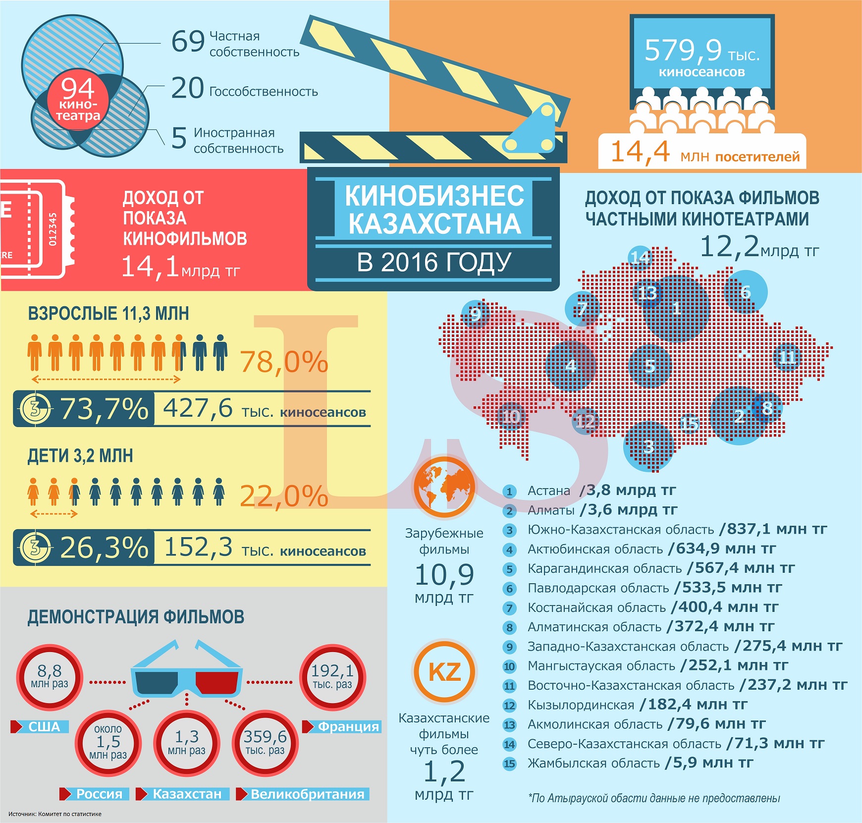 В 2016 году кинотеатры в Казахстане заработали 14,1 млрд тенге, передает LS. Показы фильмов проводились в 94 кинотеатрах, 20 из которых являются гособъектами, 69 - частной собственностью, а 5 – иностранной.