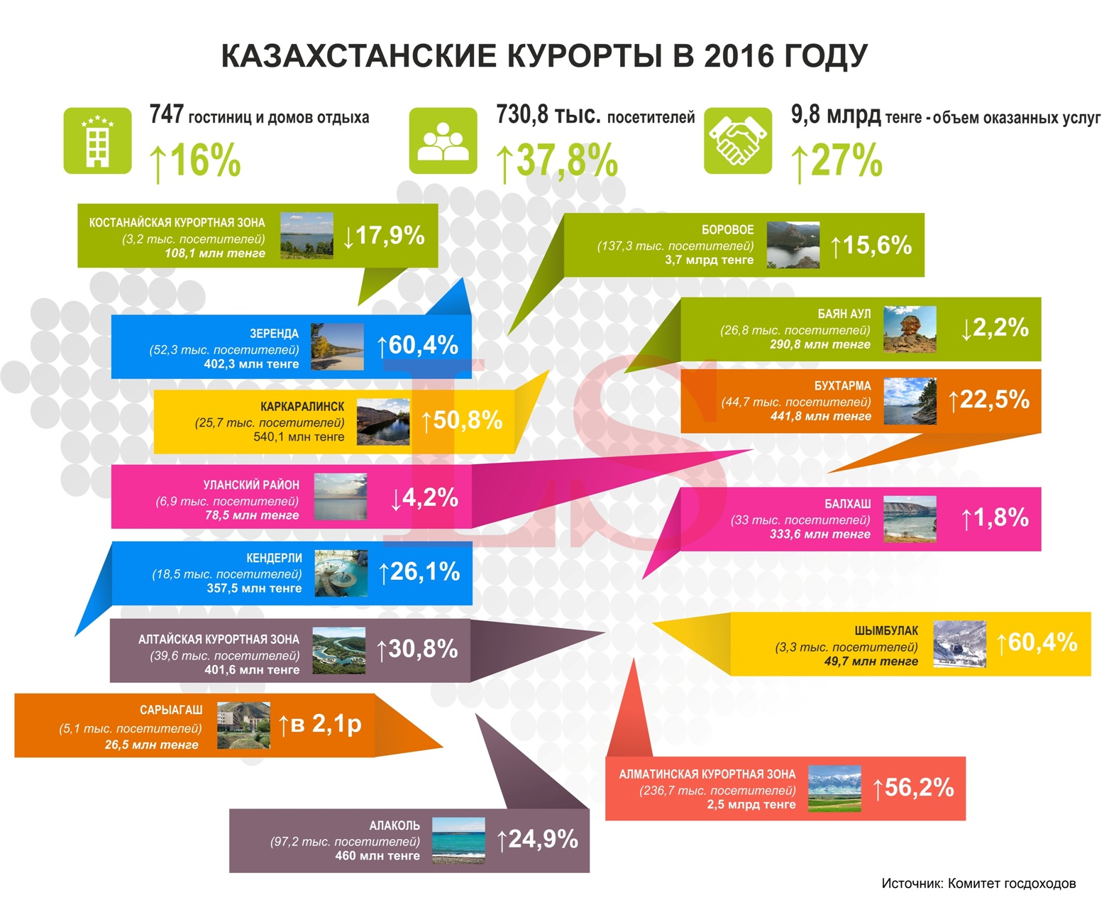 По данным ведомства, казахстанские курорты за указанный период заработали 9,8 млрд тенге, увеличив выручку в сравнении аналогичным показателем 2015 года на 27%. За 12 месяцев 747 гостиниц, санаториев и домов отдыха приняли 730,8 тыс. посетителей (на 37,8% больше чем в 2015 году).