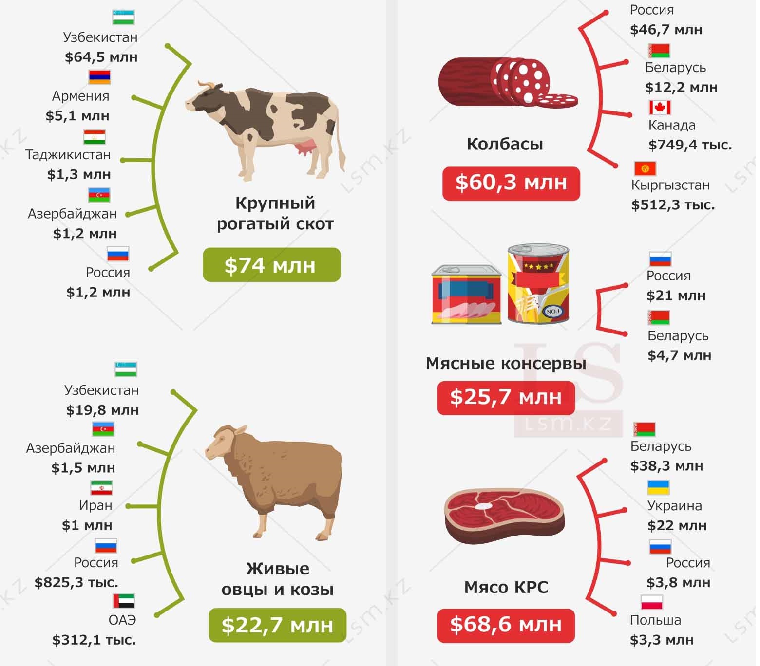 Глава НПП "Атамекен" Аблай Мырзахметов утверждал, что Казахстан становится сырьевым придатком Узбекистана, которому поставляется скот в обмен на переработанную мясную продукцию. По этому поводу LS представляет инфографику об экспорте казахстанского скота и импорте мяса, колбас и консервов.