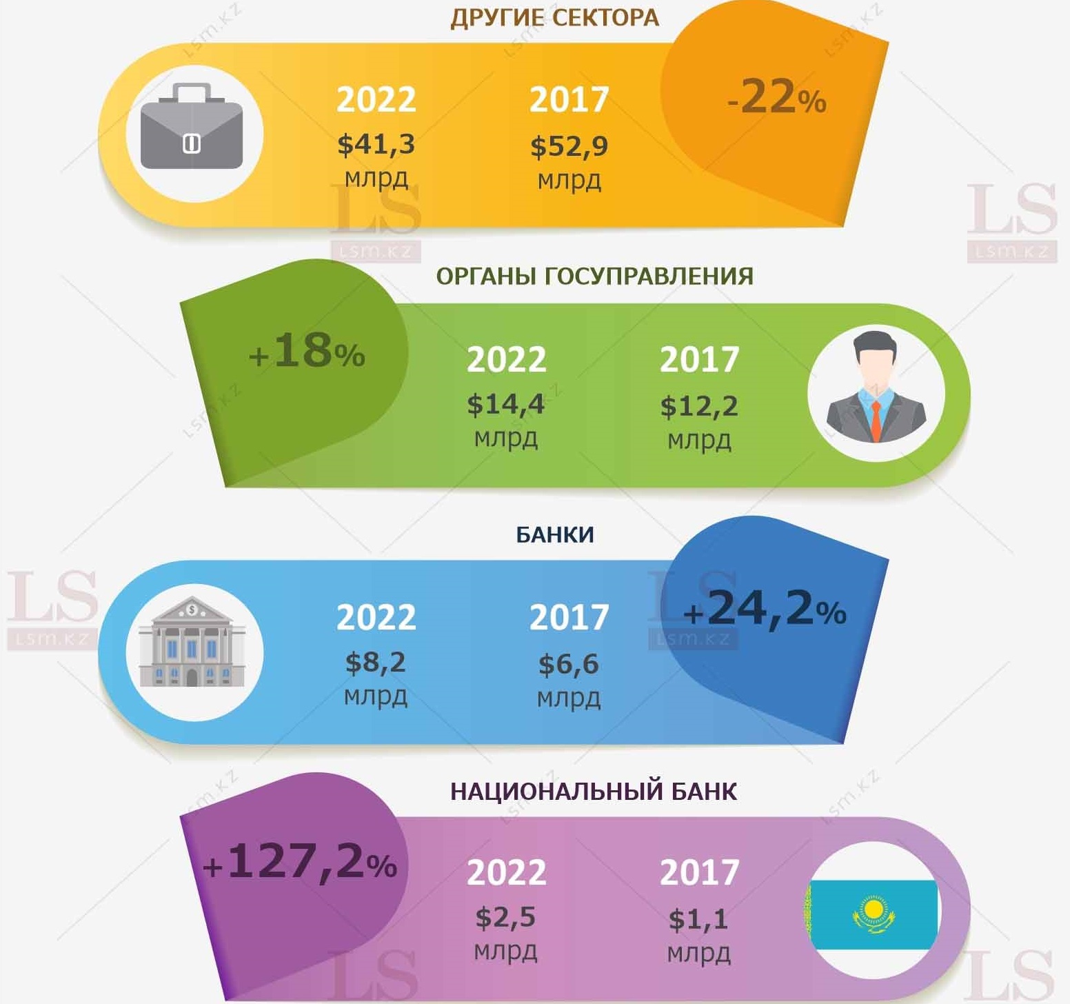При этом больше всего за пять лет увеличились обязательства Нацбанка – с $1,1 млрд до $2,5 млрд (+127,2%). Далее следуют банки, где задолженность выросла на 24,2%, до $8,2 млрд, и органы госуправления – на 18%, до $14,4 млрд.