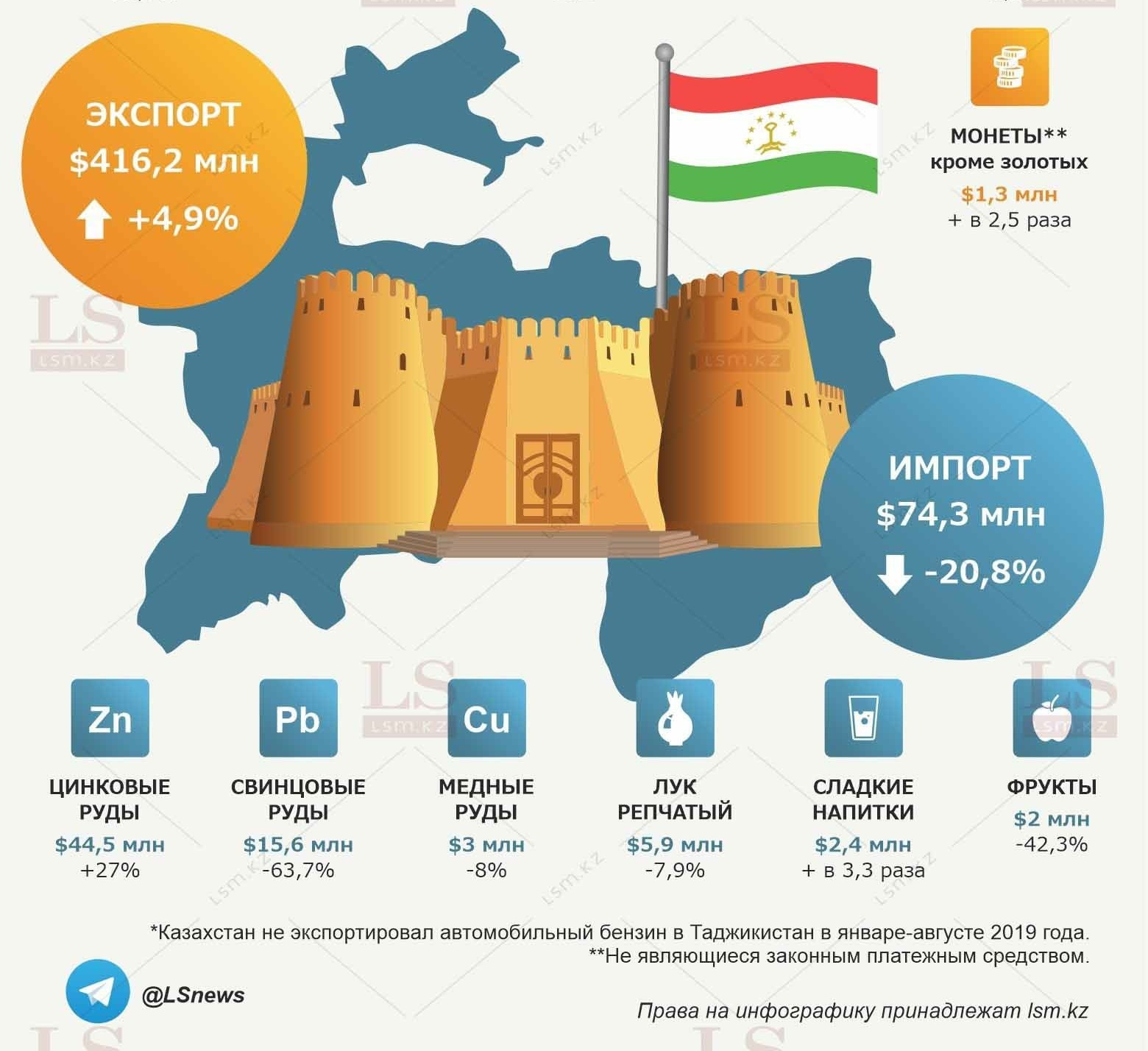 Что касается импорта, то он, напротив, показал снижение. Поставки из Таджикистана в Казахстан за восемь месяцев составили $74,3 млн со снижением на 20,8%. В основном в перечень ввозных товаров входят руды цинковые, свинцовые и медные, а также лук, напитки и фрукты.