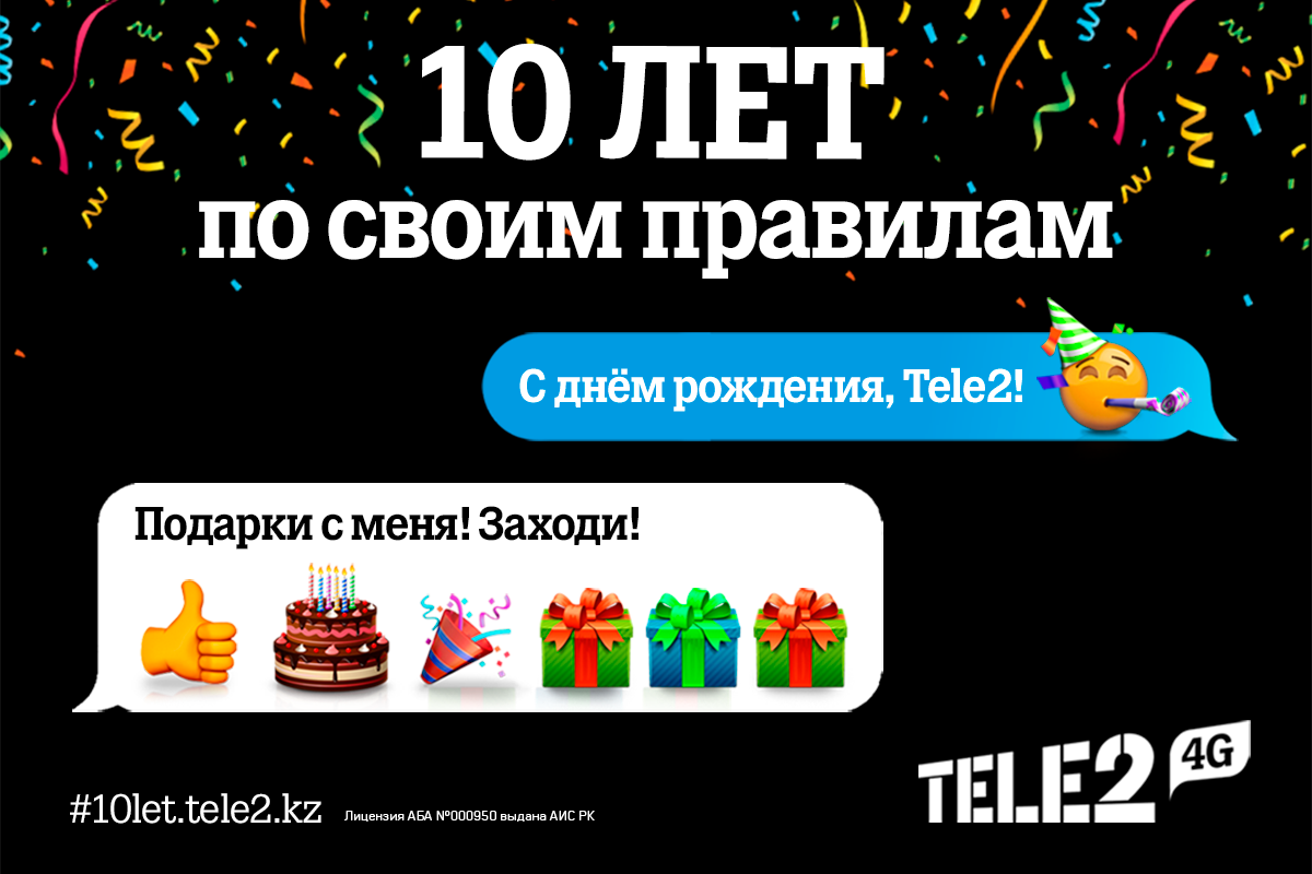 4 июня Tele2 в Казахстане исполнилось 10 лет. 3 653 дня назад в столице страны открылся офис Tele2. C тех пор в каждый из этих 87 672 часов оператор стремился дать все самое лучше своим абонентам: от гарантии лучшей цены до самой широкой сети покрытия 4G/LTE.
