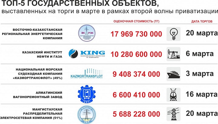 Среди следующих объектов, выставленных на торги в марте, есть пять предприятий, оценочная стоимость которых составляет свыше 1 млрд тенге.
