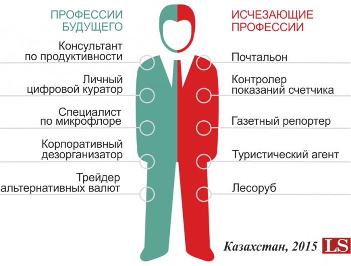Снижение спроса на данную профессию связана с тем, что основные игроки региона привлекают иностранных специалистов из-за низкой практической квалификации местных специалистов. По мнению Адлета Нургожина, вскоре стоит ожидать трансформации и слияния привычных нам профессий. «Слияние профессий - вопрос лишь времени. Большое слияние произойдет в IT-отрасли, так как ежегодное совершенствование технологий позволит создать новые инструменты и решения, из-за чего узкие специалисты в этой области отойдут на второй план. На рынке появятся универсальные инженеры, обладающие необходимым знанием для решения той или иной задачи», - резюмирует Однако эксперт не исключает, что возможен и обратный процесс, на который повлияет Запад с их подходом на коммерциализацию технологий. Могут появиться узкие специалисты, что наоборот увеличит их количество. В список "мертвых" профессий можно включить операторов пейджинговой связи и стенографистов. "Пейджер - некогда популярный способ связи со временем стал таким же непопулярным, как и данная профессия. С пришествием научно-технического прогресса, компьютеров и гаджетов, специальность стенографистов отпала хоть и не сразу, но сейчас этих специалистов не найти", - рассказывает А.Нургожин. Ранее LS публиковал список самых востребованных профессий в Казахстане. По данным портала по поиску работы hh.kz в 2014 году лидером по количеству вакансий, размещенных на сайте проекта остается профессиональная отрасль «Продажи». В этой сфере в прошлом году было размещено почти четверть всех вакансий – 24,5%. На втором месте профотрасль «Бухгалтерия, финансы» - 10,1%, далее «IT, Интернет, телеком» - 9,7%.