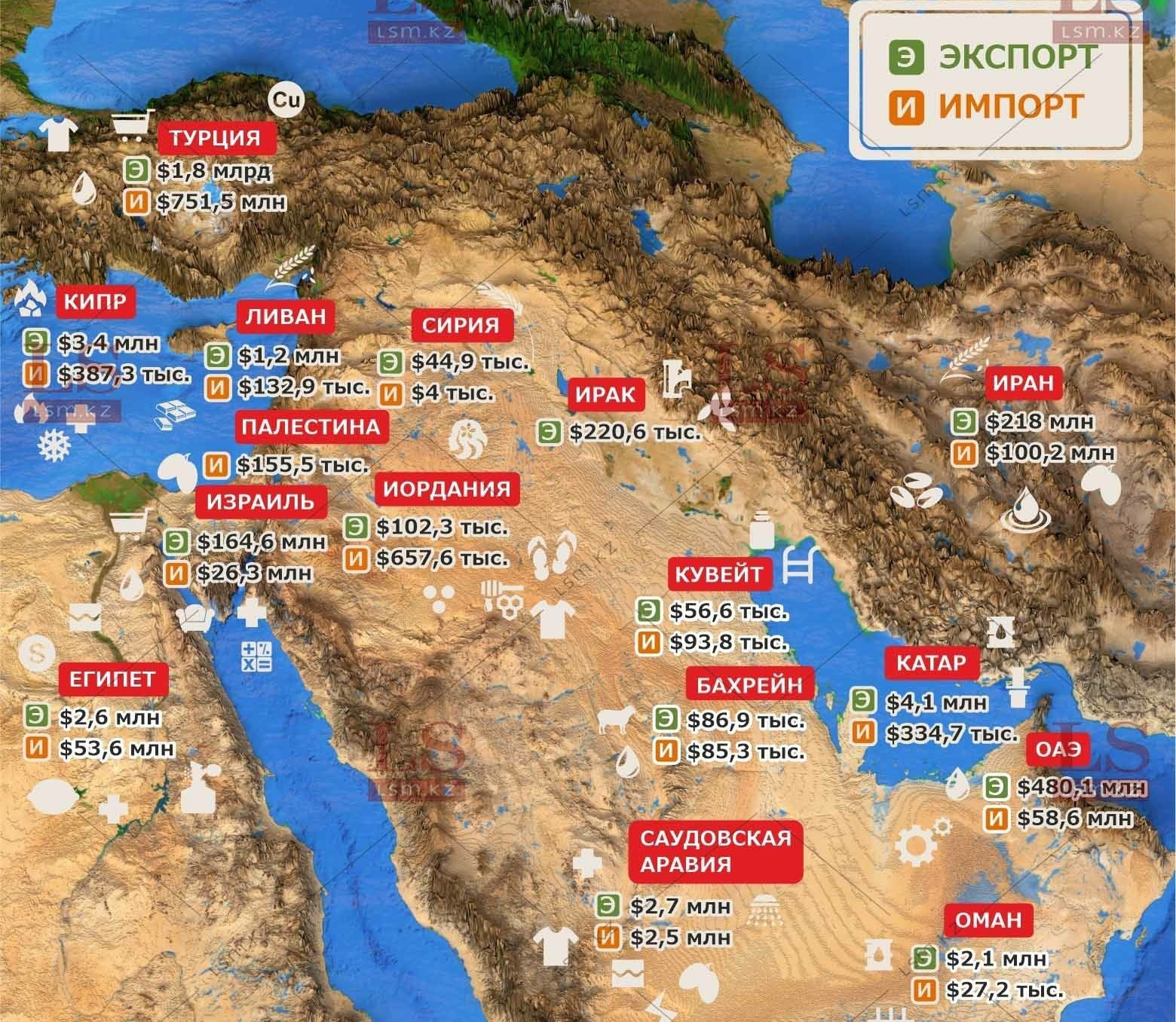 Казахстан продает странам Ближнего Востока нефть, ферросплавы, пшеницу, медь, а покупает у них лекарства, одежду, орехи и шоколад. LS показывает в инфографике торговлю с данным регионом и основные товары.