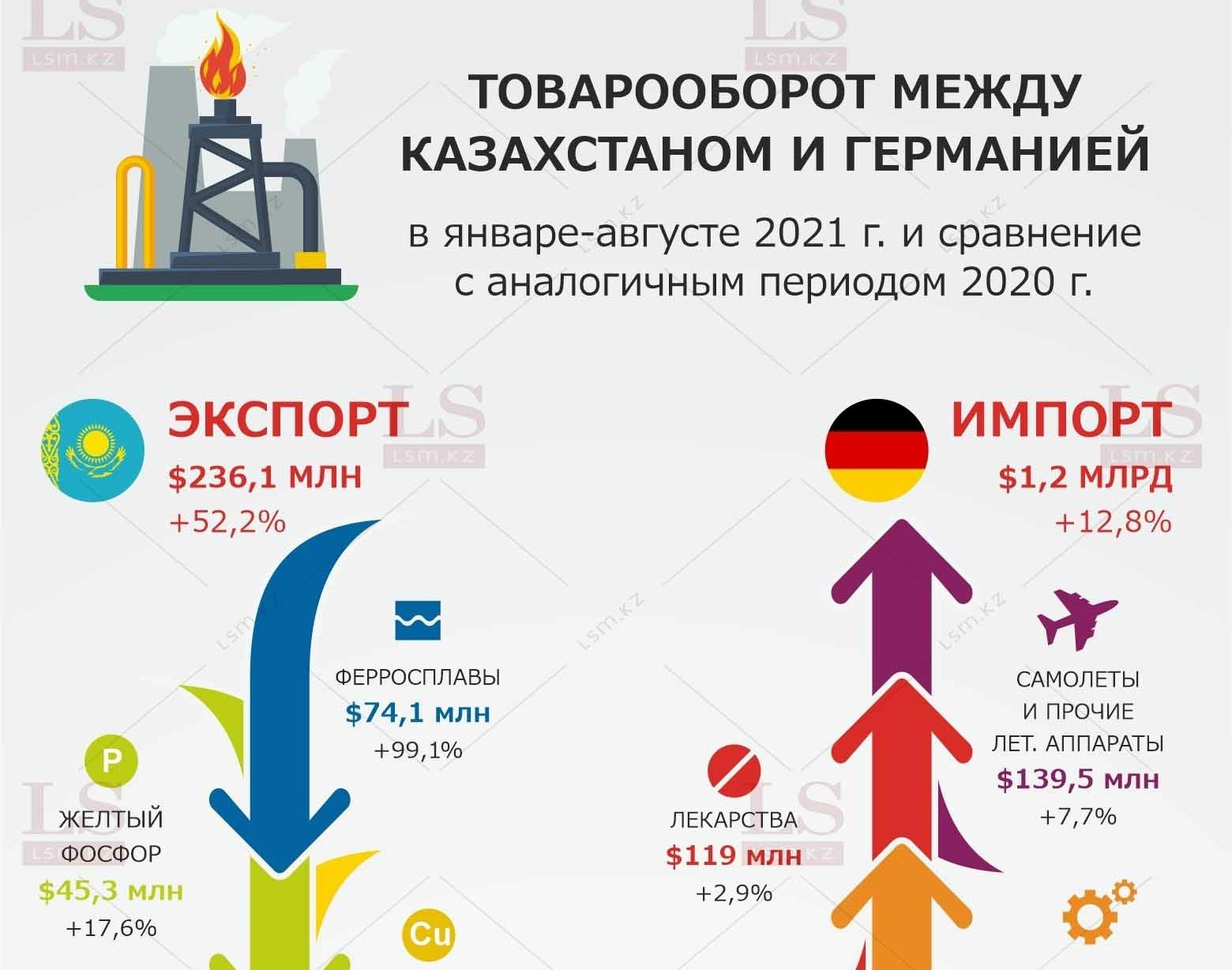 За восемь месяцев 2021 года Казахстан экспортировал в Германию товары на $236,1 млн, что на 52,2% больше, чем в аналогичном периоде 2020 года.