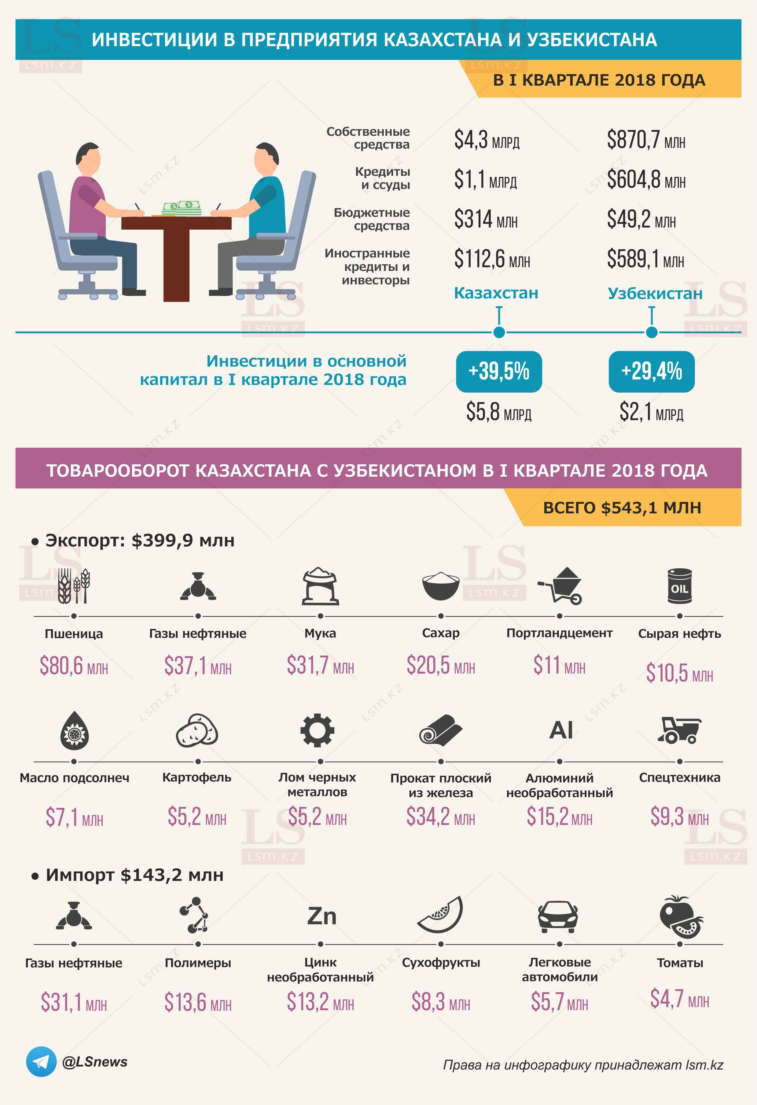 "Товарооборот в 2017 году был $2 млрд, по сравнению с 2016 годом рост составил 31%. За полугодие этого года оборот составил уже $1,2 млрд и по сравнению с аналогичным периодом прошлого года вырос на 35%. Казахстанcкий экспорт в Узбекистан состоит в основном из зерна, муки и руды, а импорт – это природный газ, фрукты и овощи", - отметил он.