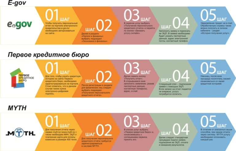 Получить персональный кредитный отчет можно в офисах кредитных бюро и в центрах обслуживания населения. Также при наличии электронной цифровой подписи (ЭЦП) сведения можно получить через порталы www.1cb.kz, www.egov.kz, www.myth.kz.