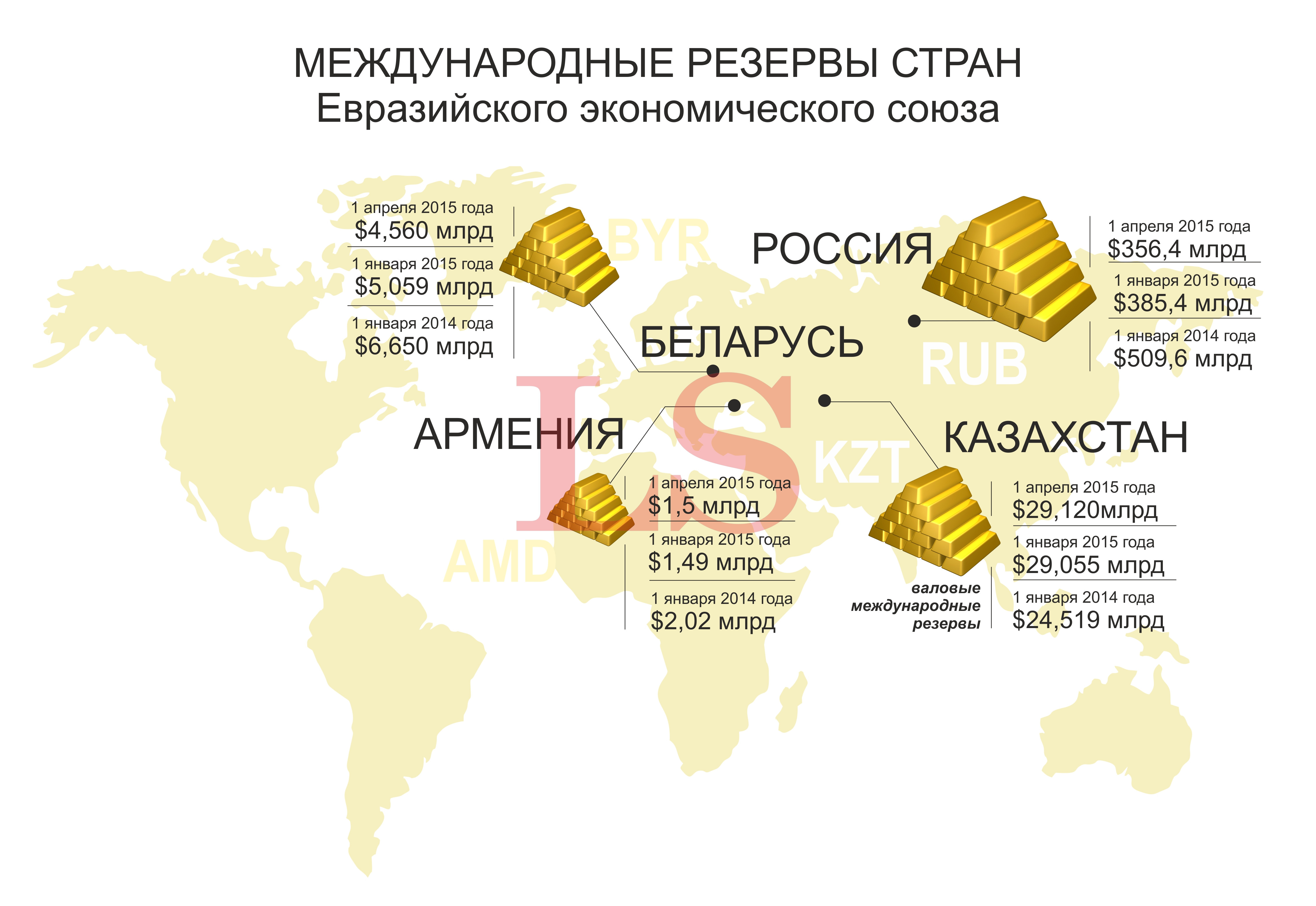 Армения В резерве Армении находиться всего $1,5 млрд (на 1 апреля 2015 года). Согласно данным armbanks, который ссылается на данные регулятора, международные валовые резервы Армении в декабре 2014 года показывали небольшое снижение до $1,49 млрд. В январе 2014 года резервы составляли $2,02 млрд. Напомним, договор о создании ЕАЭС был подписан в мае 2014 года в Астане. Союз начал функционировать с 2015 года. Армения присоединилась к союзу со 2 января 2015 года.
