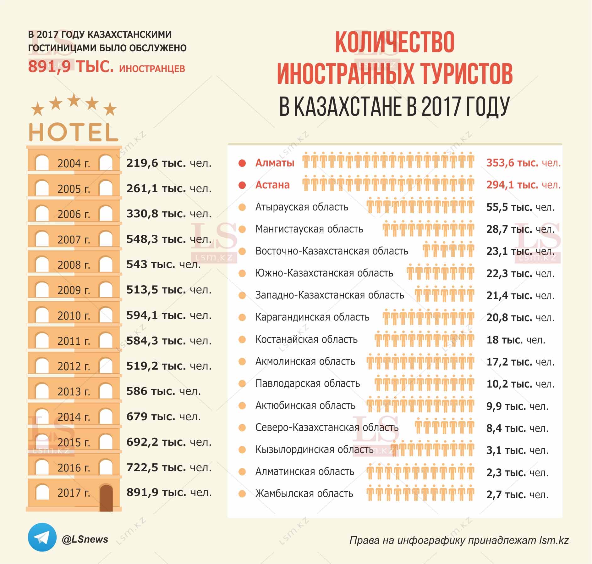 В 2017 году в казахстанских гостиницах остановилось 891,9 тыс. гостей из-за границы, передает LS.