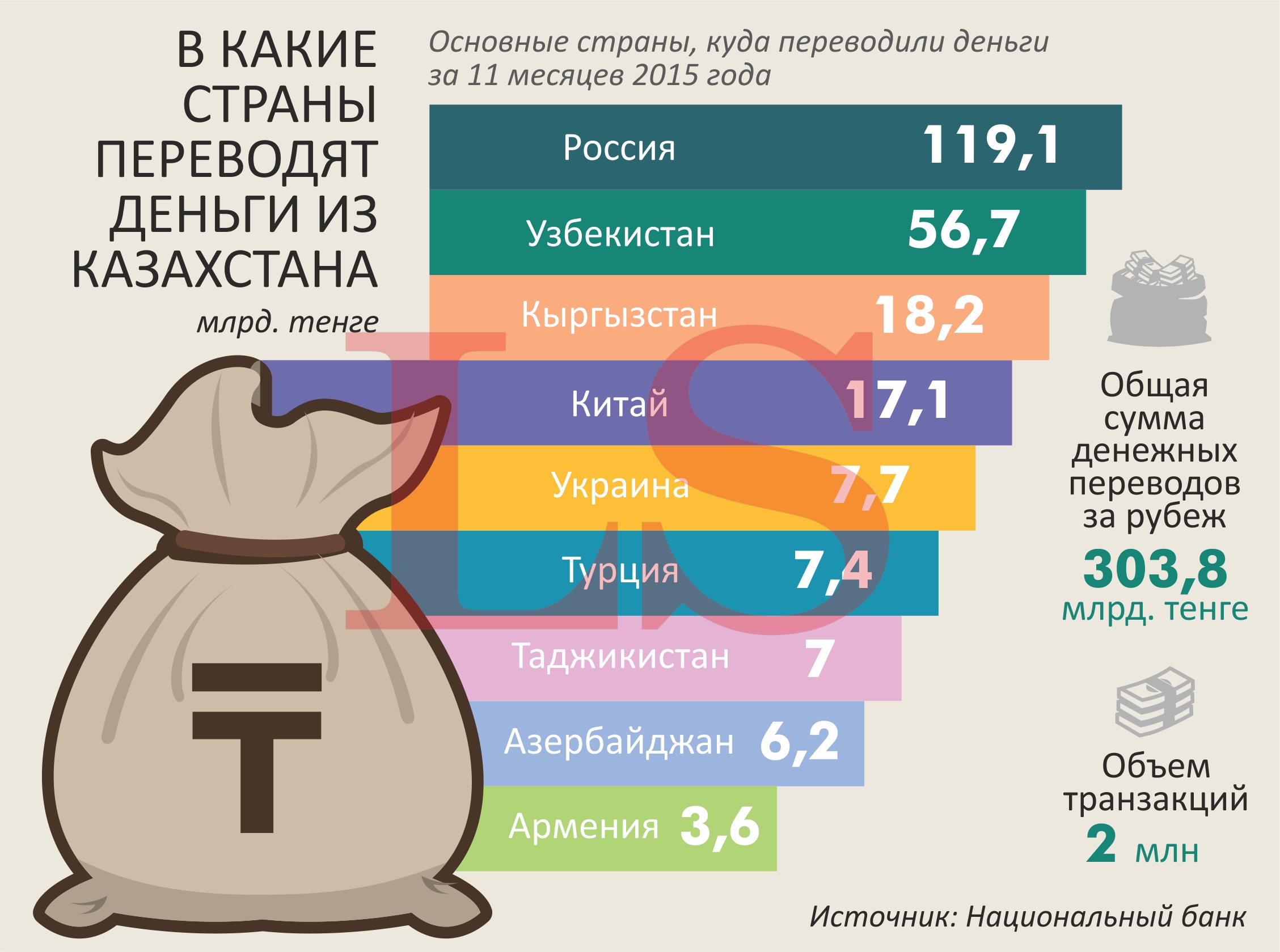 Лидером среди стран по объемам осуществленных переводов из Казахстана является Россия, туда было отправлено 119,1 млрд тенге. За ней следует Узбекистан, куда казахстанцы перевели 56,7 млрд тенге. Объемы транзакции в Китай и Кыргызстан составили 17 и 18 млрд тенге соотвественно.
