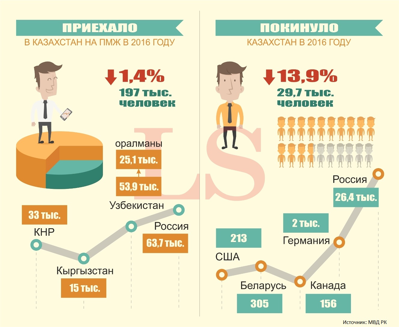 Что касается притока, то в Казахстан на ПМЖ в 2016 году переехало 197 тыс. человек. Этот показатель снизился на 1,4% с 199,9 тыс. в 2015 году.