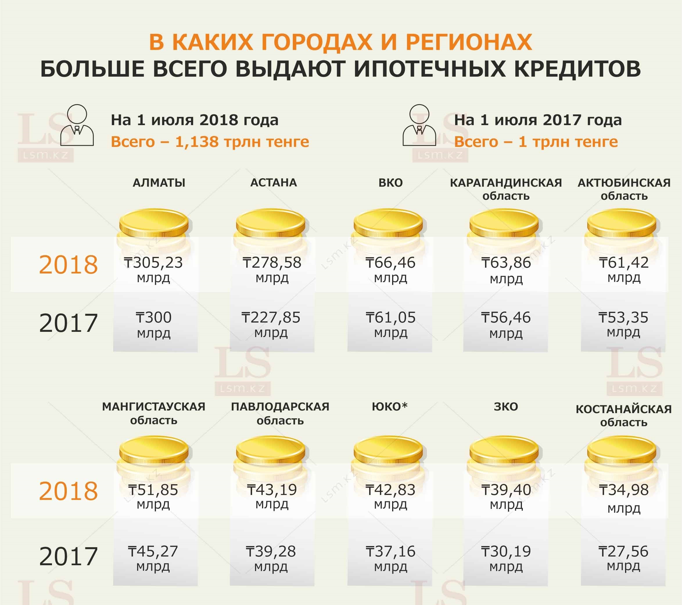 Наибольшие объемы ипотечных займов на 1 июля 2018 года сконцентрированы в крупнейших городах: на Алматы приходится – 305,23 млрд тенге, на Астану – 278,58 млрд тенге.
