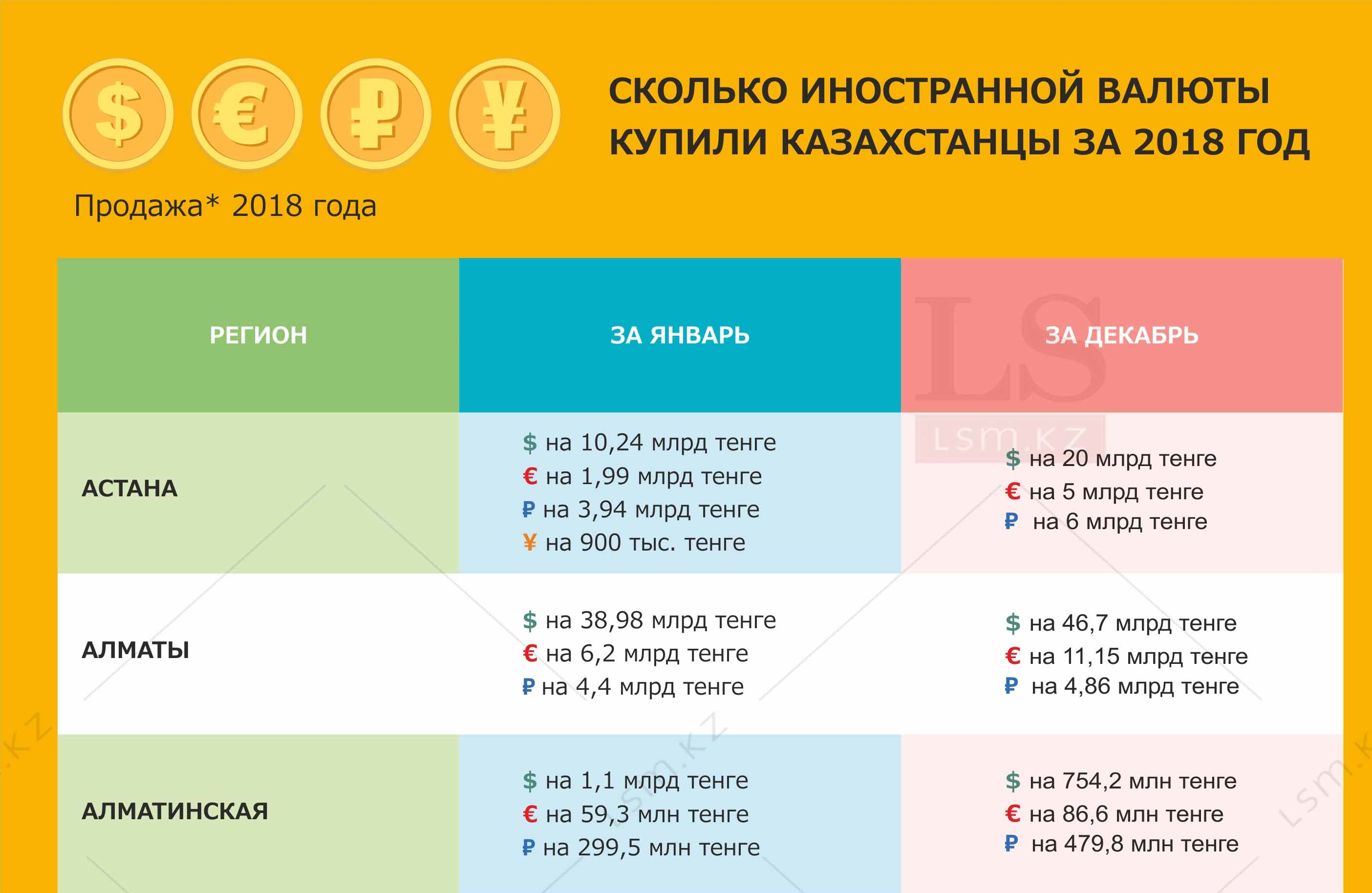 LS подготовил инфографику о том, сколько иностранной валюты купили казахстанцы в январе и декабре 2018 года.