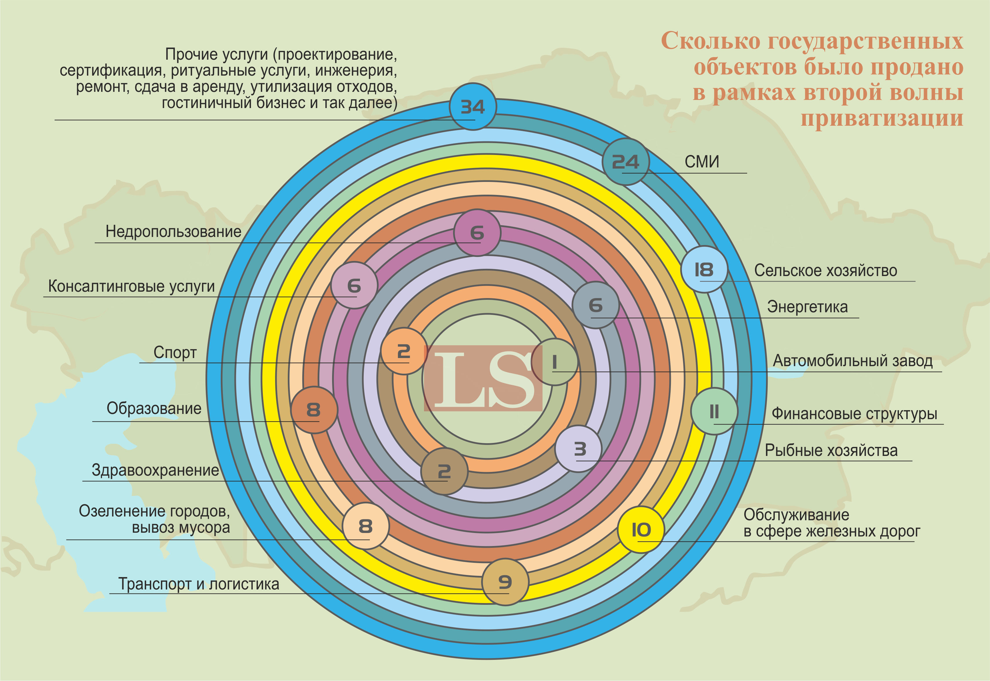 Вторыми по количеству реализованных активов стали объекты сельского хозяйства – 18. Далее финансовые структуры – 11. Объекты, занятые обслуживанием в сфере железных дорог – 10. Количество приватизированных предприятий транспорта, перевозок и логистики составило девять. На городские службы (озеленение, вывоз мусора) и сферу образования на каждый приходится по восемь активов. Среди проданных активов также оказались три рыбных хозяйства и автомобилестроительный завод «Сарыаркаавтопром».