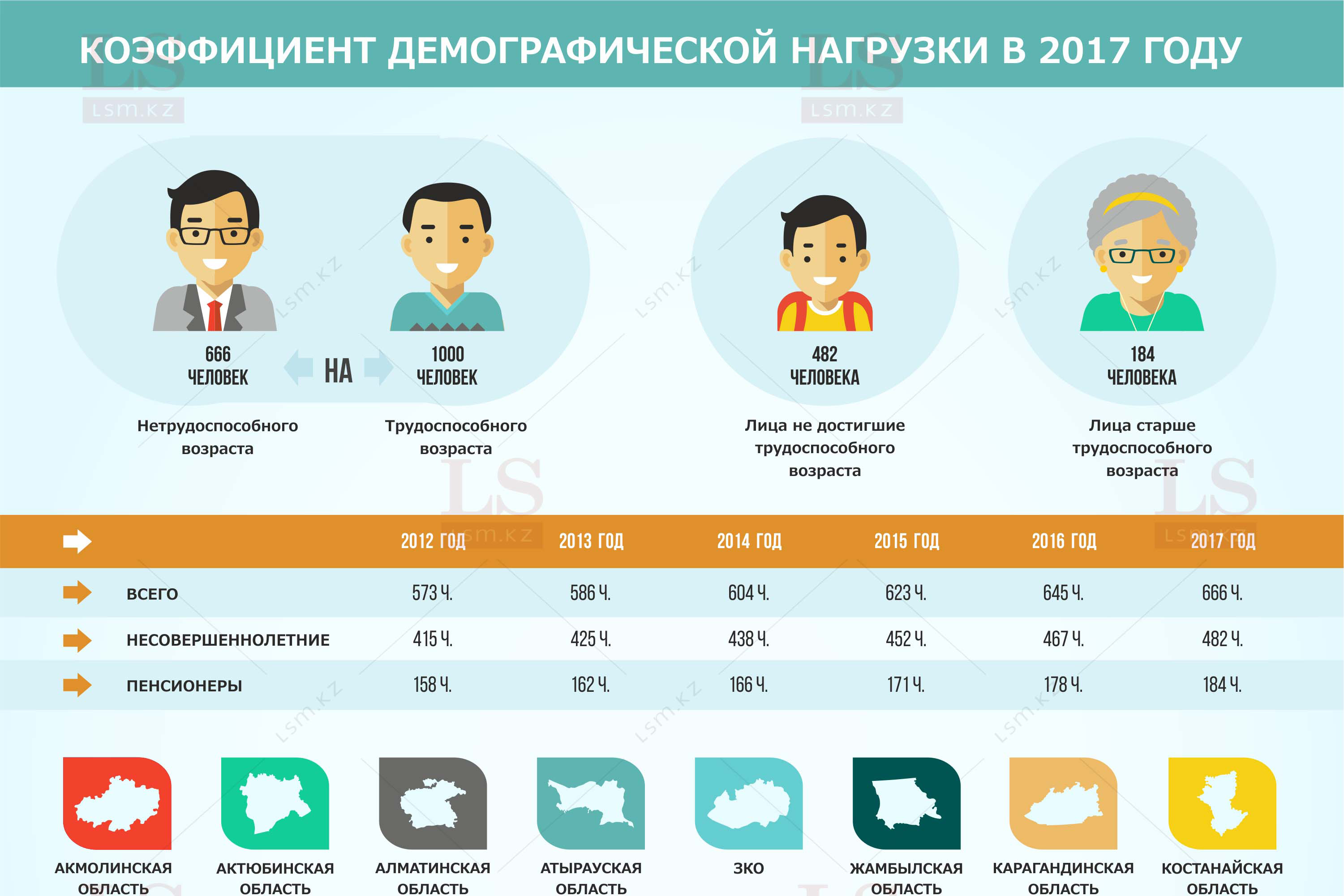 Самая высокая демографическая нагрузка зафиксирована в ЮКО (803 ч.) и Жамбылской области (781 ч.), а самая низкая – в Астане (553 ч.) и в Алматы (521 ч.).