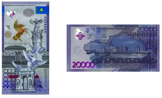 Дизайн банкнот выполнен в едином стиле с находящимися в обращении денежными знаками: лицевая сторона содержит преимущественно вертикальные изображения, оборотная сторона – горизонтальные. Размеры банкноты 20 000 тенге: 155х79 мм.