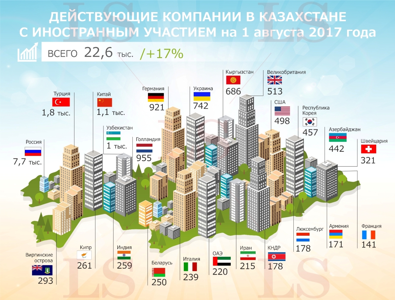 На 1 августа 2017 года количество действующих компаний с иностранным участием в Казахстане составило 22,6 тыс., передает LS.