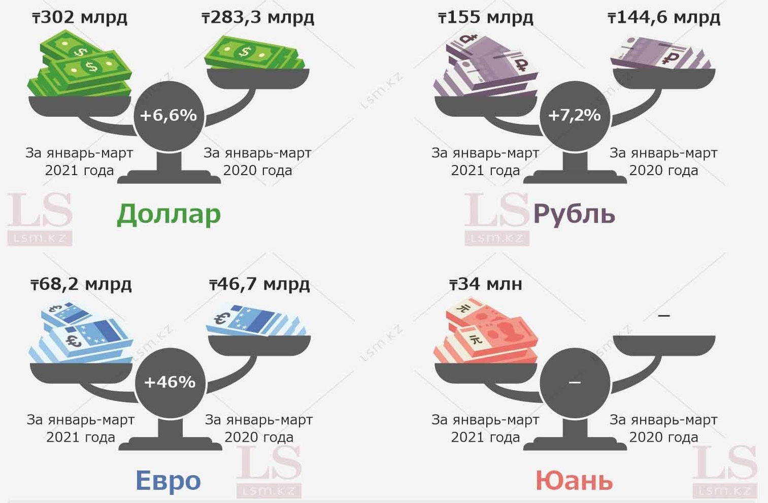 По данным Национального банка, за первые три месяца 2021 года обменные пункты реализовали иностранную валюту на 525,3 млрд тенге. Это на 10,7%, или на 50,7 млрд тенге, больше, чем за аналогичный период 2020 года. Из них на доллары потратили 302 млрд тенге, на рубли – 155 млрд тенге, на евро – 68,2 млрд тенге, на юань – 34 млн тенге.