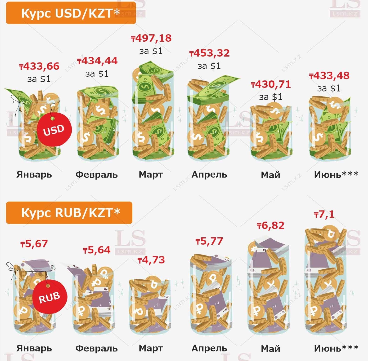Средний курс тенге в январе, по данным Нацбанка, составлял 433,66 за $1, в феврале – 434,44 за $1, в марте – 497,18, в апреле – 453,32, в мае – 430,71 тенге за $1.