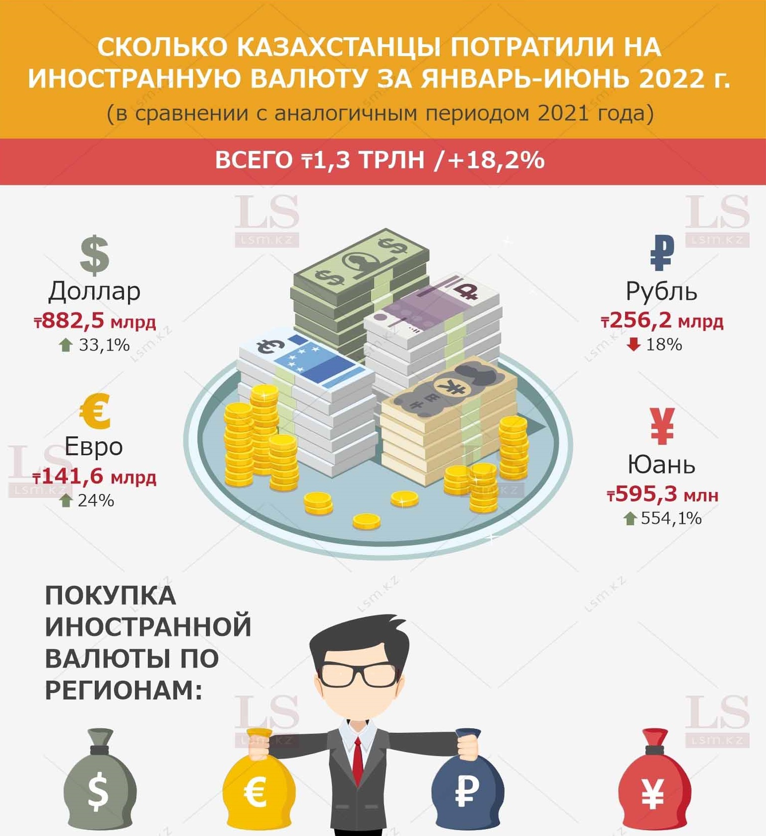 За шесть месяцев 2022 года казахстанцы потратили на покупку иностранной валюты более 1 трлн тенге. LS подготовил инфографику о том, какая валюта пользуется большей популярностью.