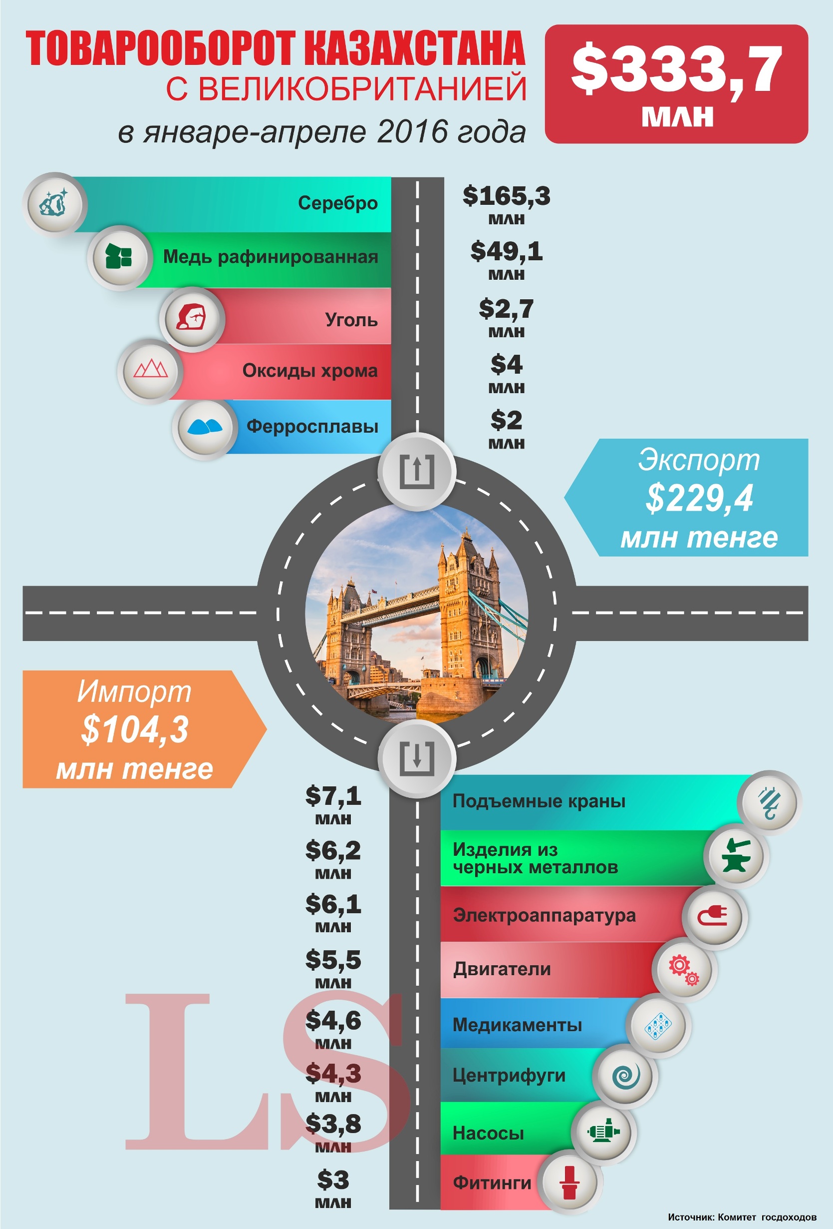Товарооборот Казахстана с Великобританией в январе-апреле 2016 года составил $333,7 млн, передает LS.