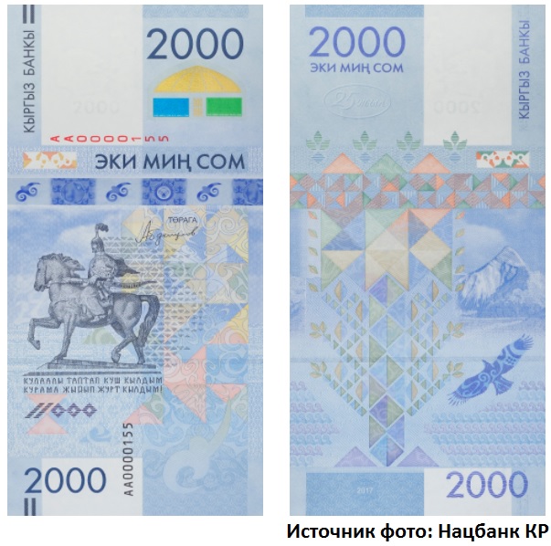 С 17 ноября Нацбанк начинает выпуск первой памятной вертикальной банкноты номиналом 2 тыс. сомов. Руководство Нацбанка призывает граждан не покупать новые купюры дороже номинала. Новая банкнота имеет очень оригинальный дизайн и высокий уровень защиты. Ее выпуск приурочен к 25-летию независимости Кыргызстана и введения национальной валюты.