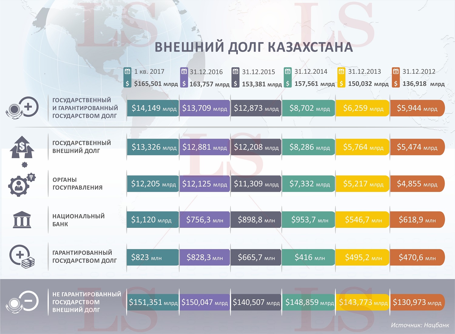 Согласно данным Национального банка, доля государственного и гарантированного государством долга составила 8,5%, или $14,149 млрд. Доля сохранилась на прежнем уровне относительно информации по данным на конец 2016 года. Однако в денежном выражении объем вырос за последние 12 месяцев на $444,7 млн.