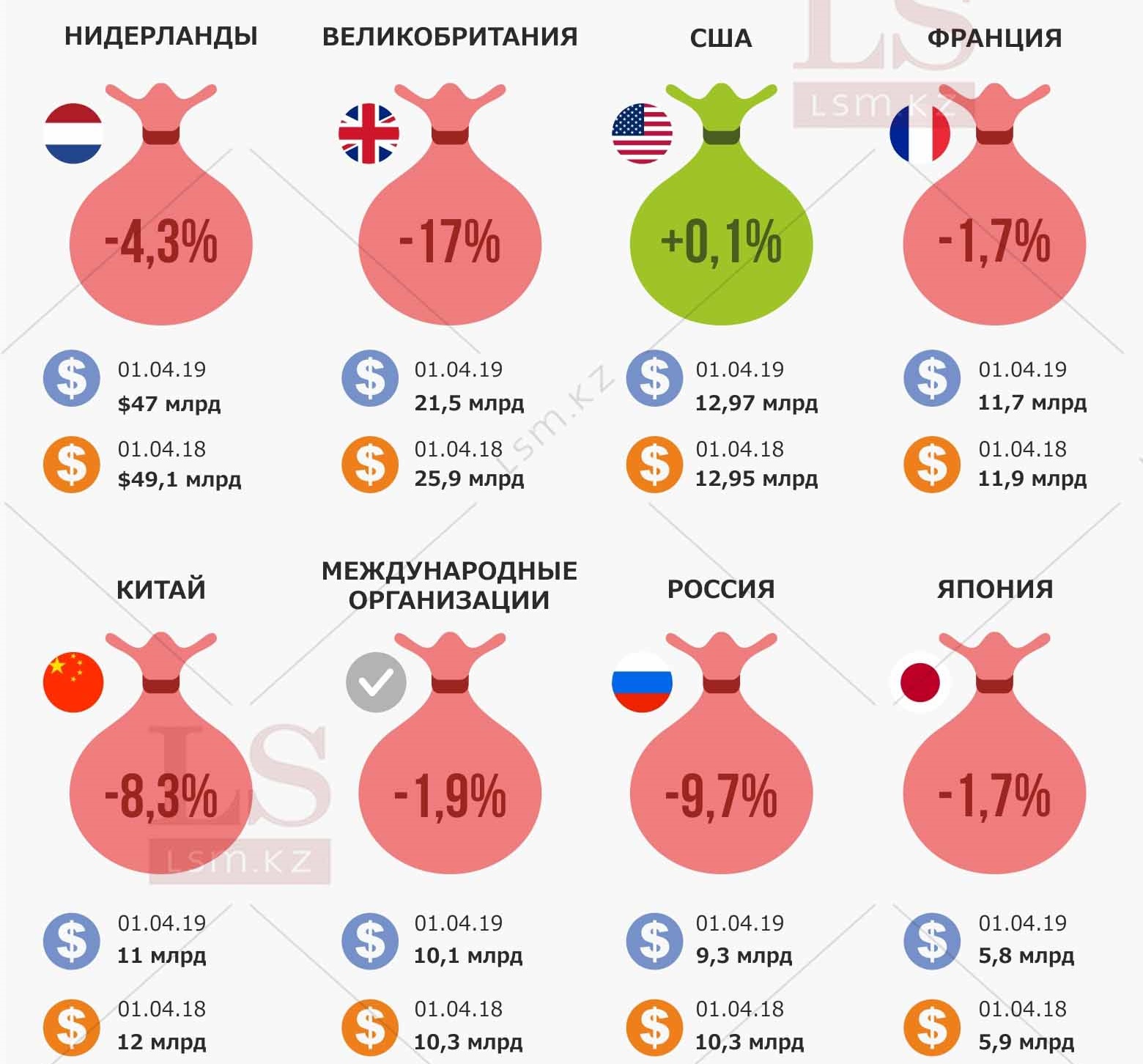 По данным Национального банка, наибольшая задолженность, по-прежнему приходится на Нидерланды – $47 млрд ($49,1 млрд в 2018 году). Больше всего страна увеличила долг перед ОАЭ на $240 млн и Германией – на $160 млн.