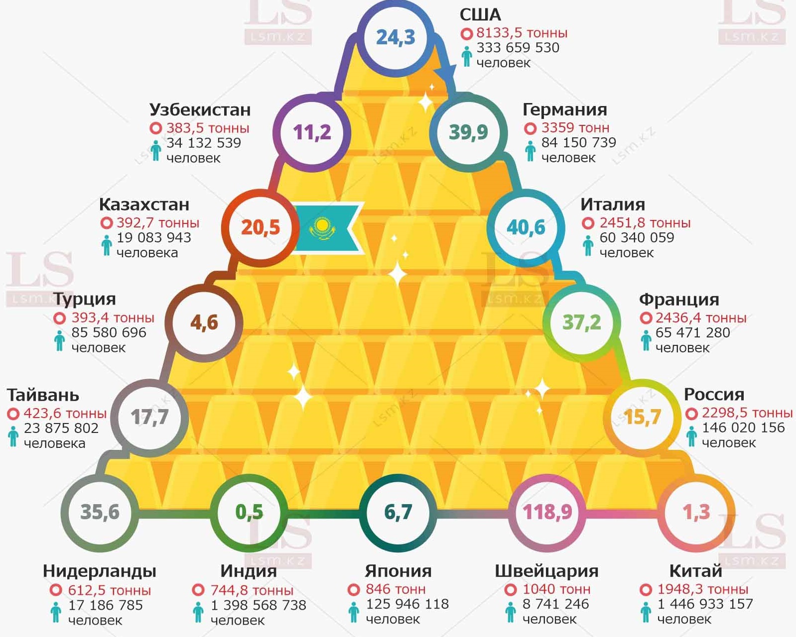 Согласно данным World Gold Council, на 1 ноября этого года объем желтого металла Казахстана достиг 392,7 тонны (13-е место без учета МВФ и ЕЦБ). Всего в республике проживает более 19 млн человек (на 15 ноября 2021 года). Таким образом, на каждого жителя страны приходится по 20,5 грамма золота.